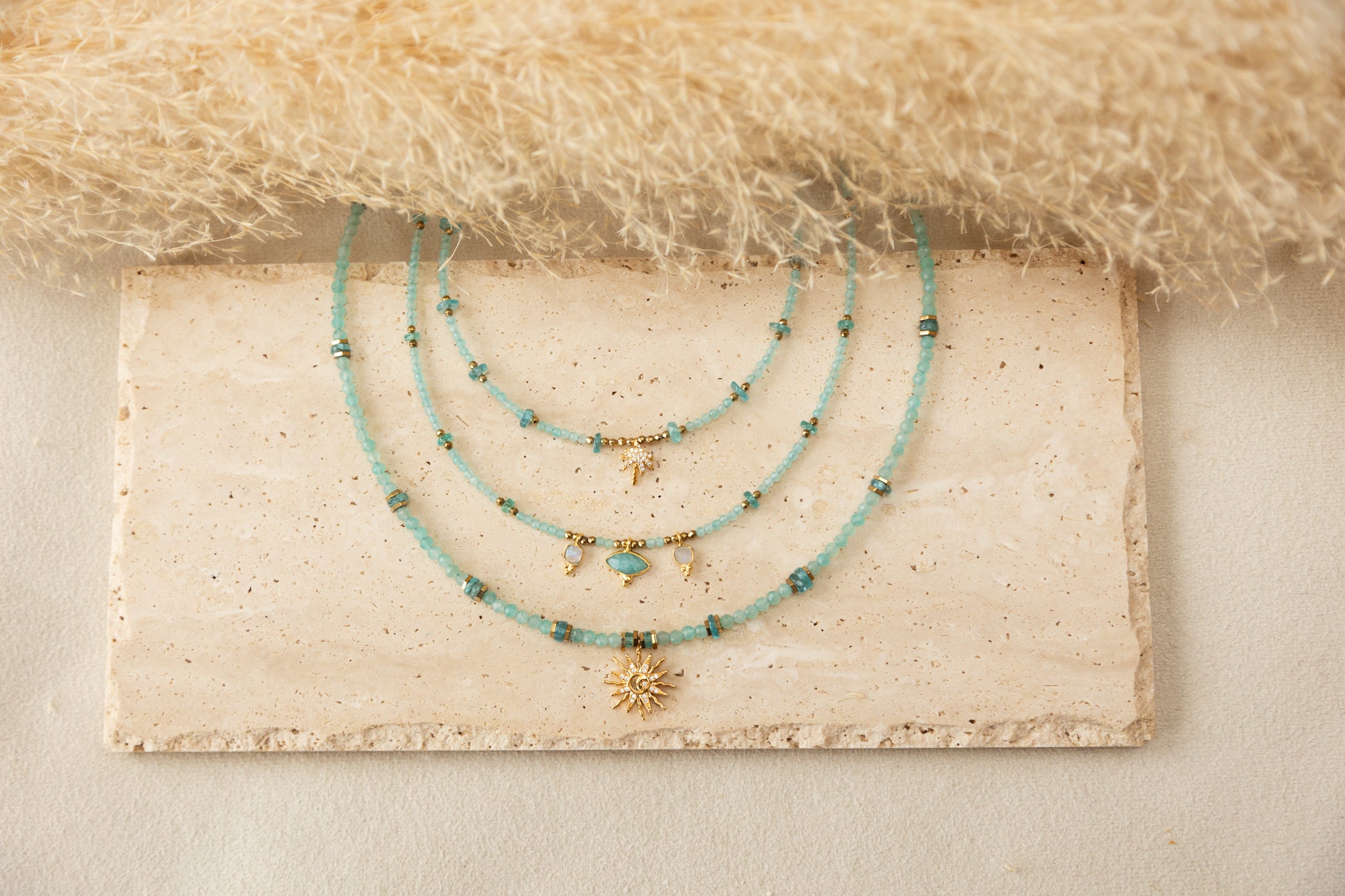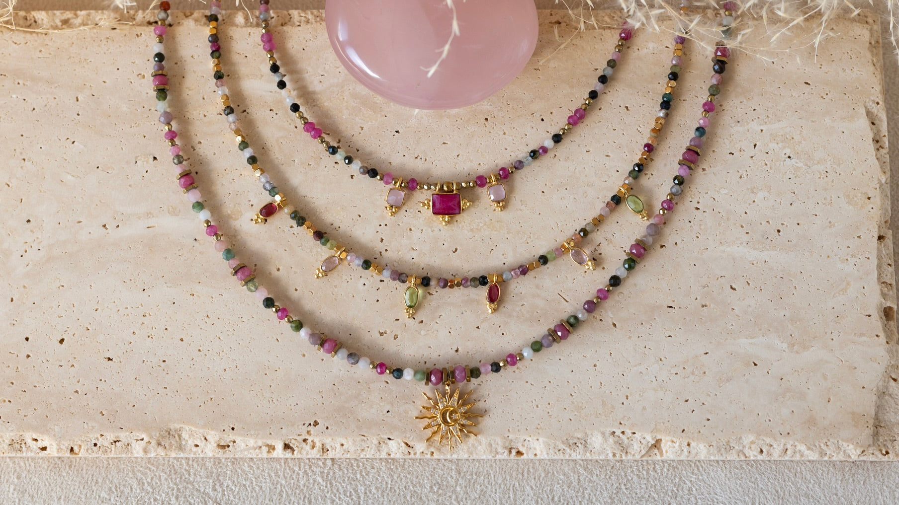 Les fils dorés, chaînes et pampilles en plaqué or ou argent mettent en valeur de magnifiques pierres semi-précieuses aux vertus énergisantes ou apaisantes.