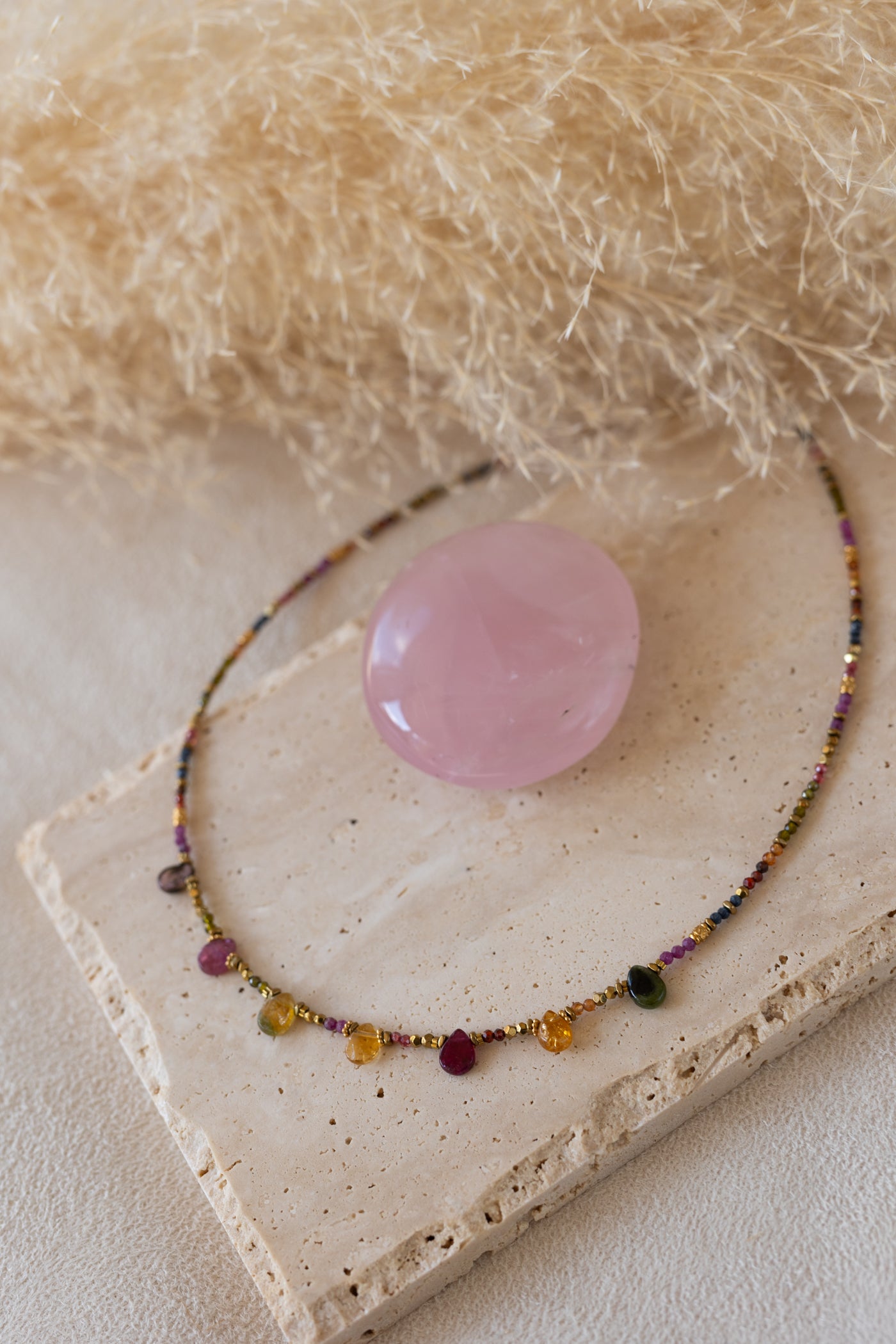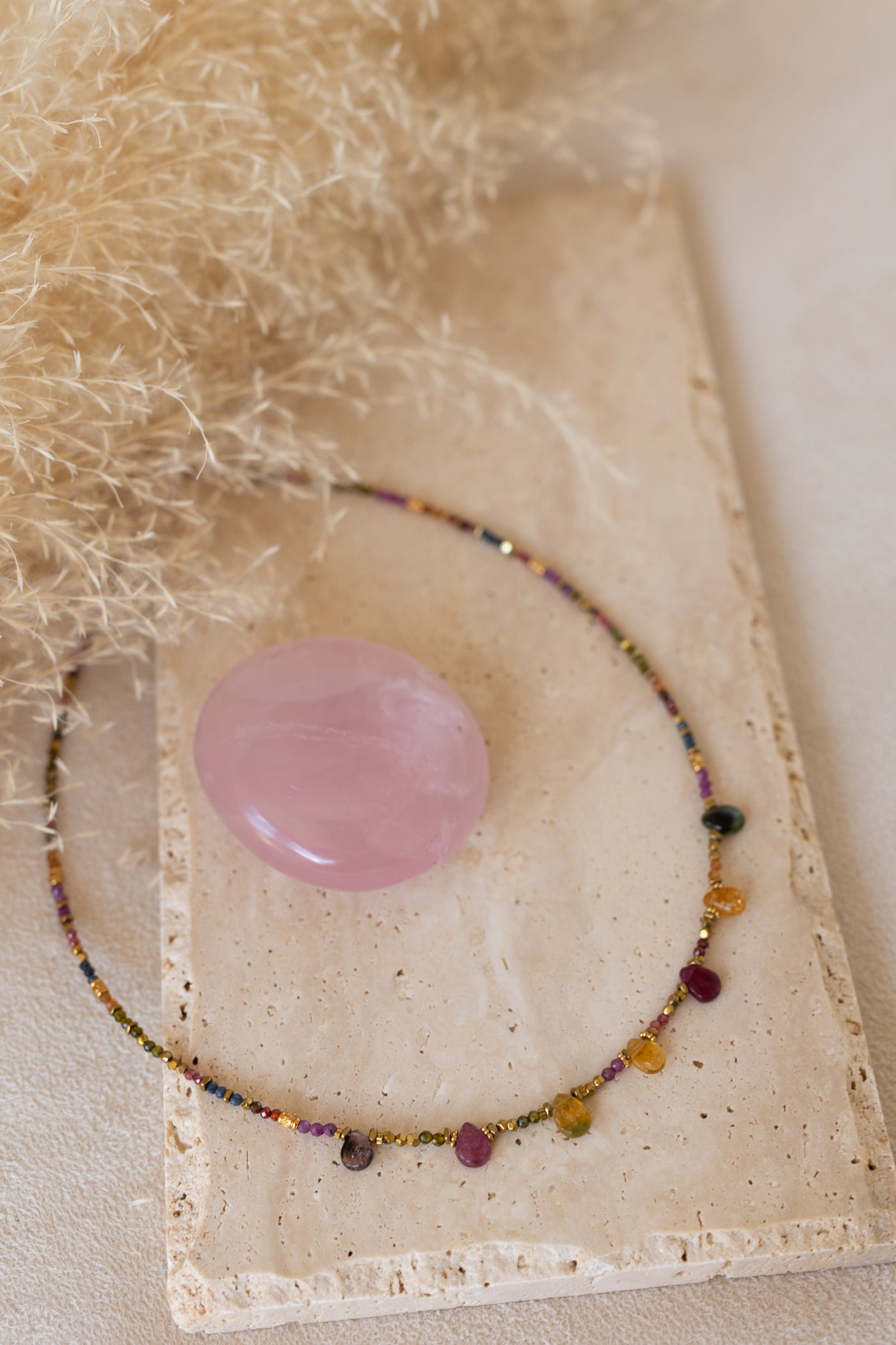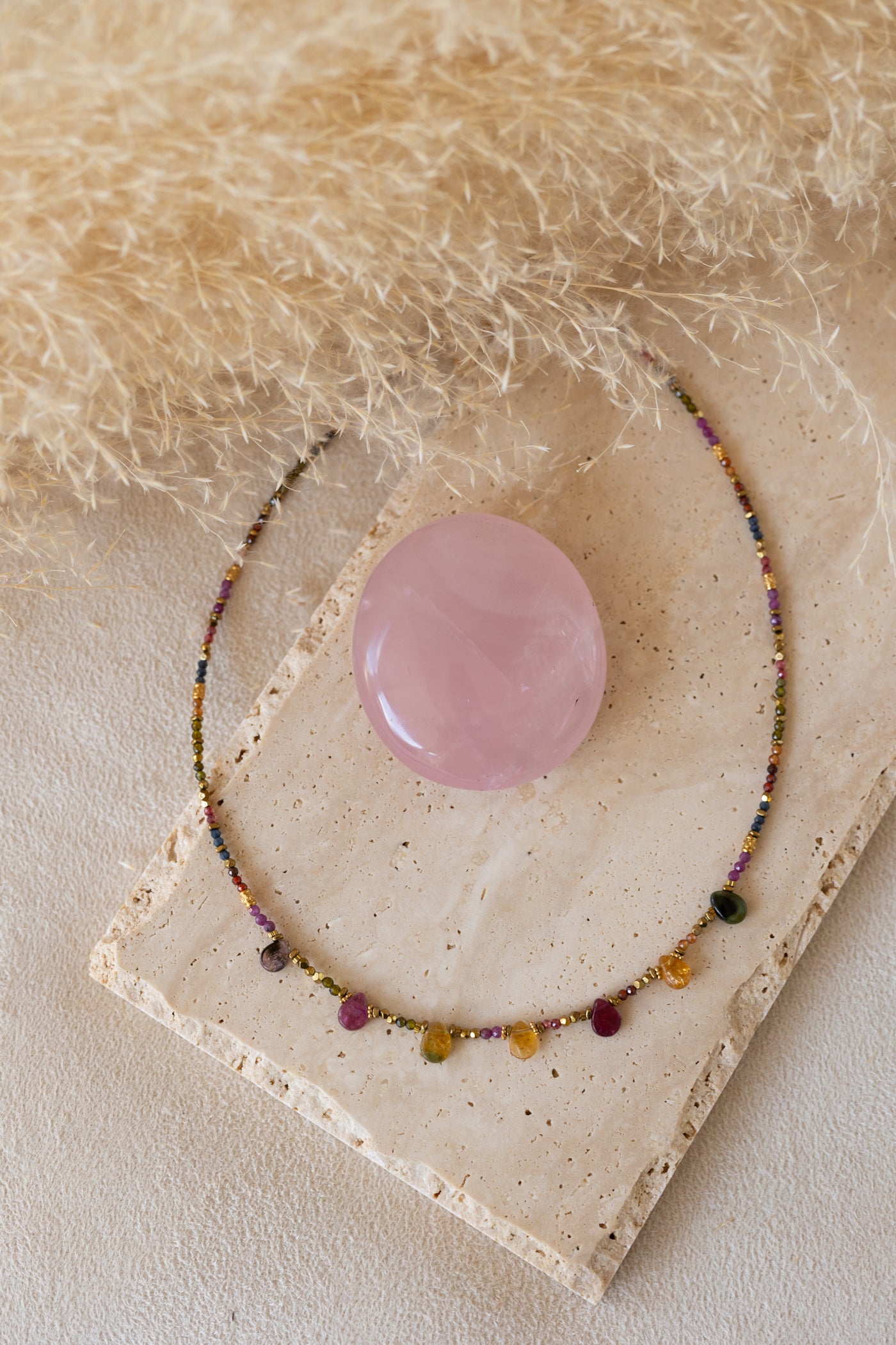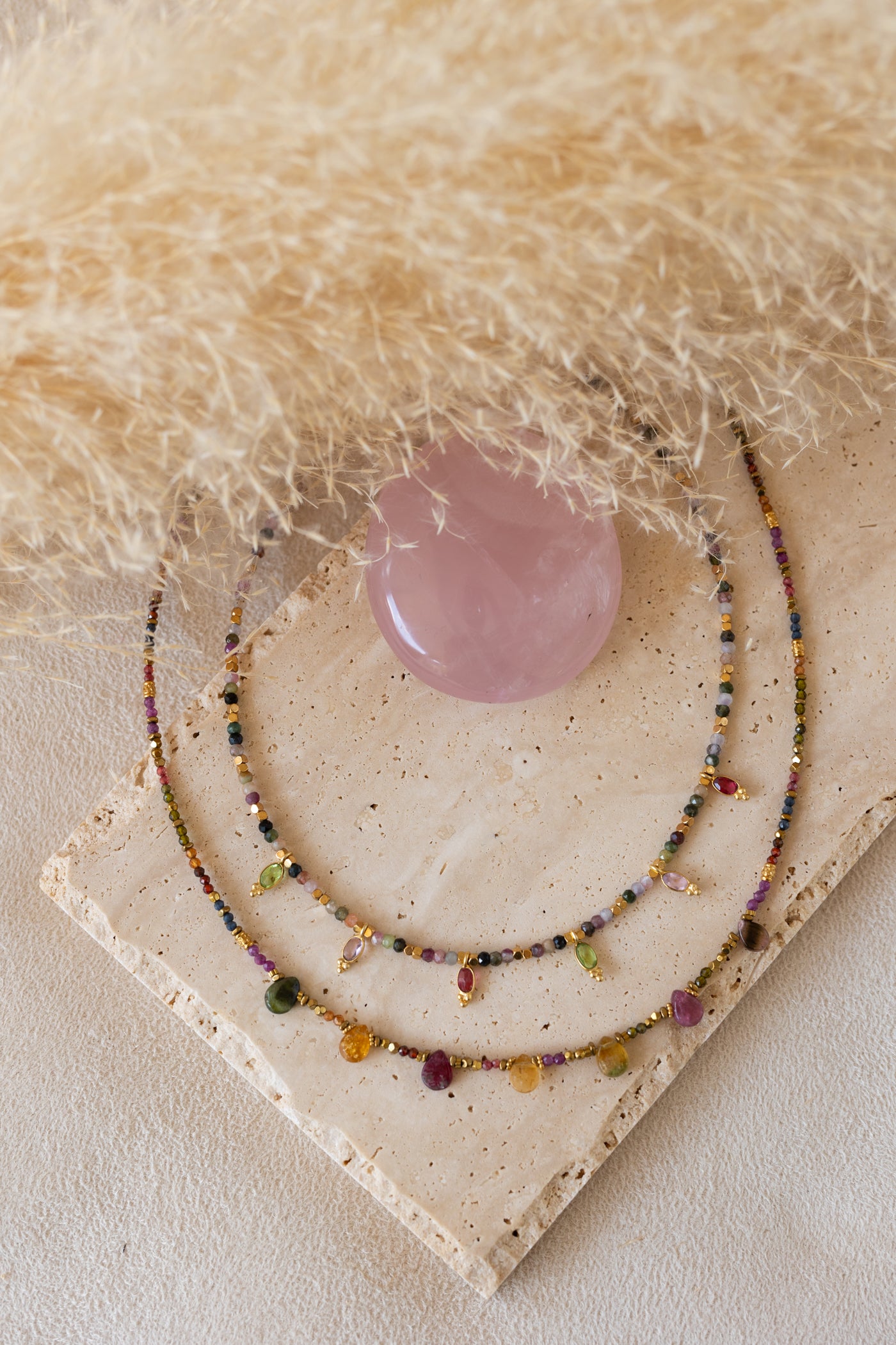 ° Le collier Théa délicat et raffinés en pierres fines semi-précieuses de Tourmaline multicolores dégradées, orné de petites pierres illumine et transmet de belles énergie