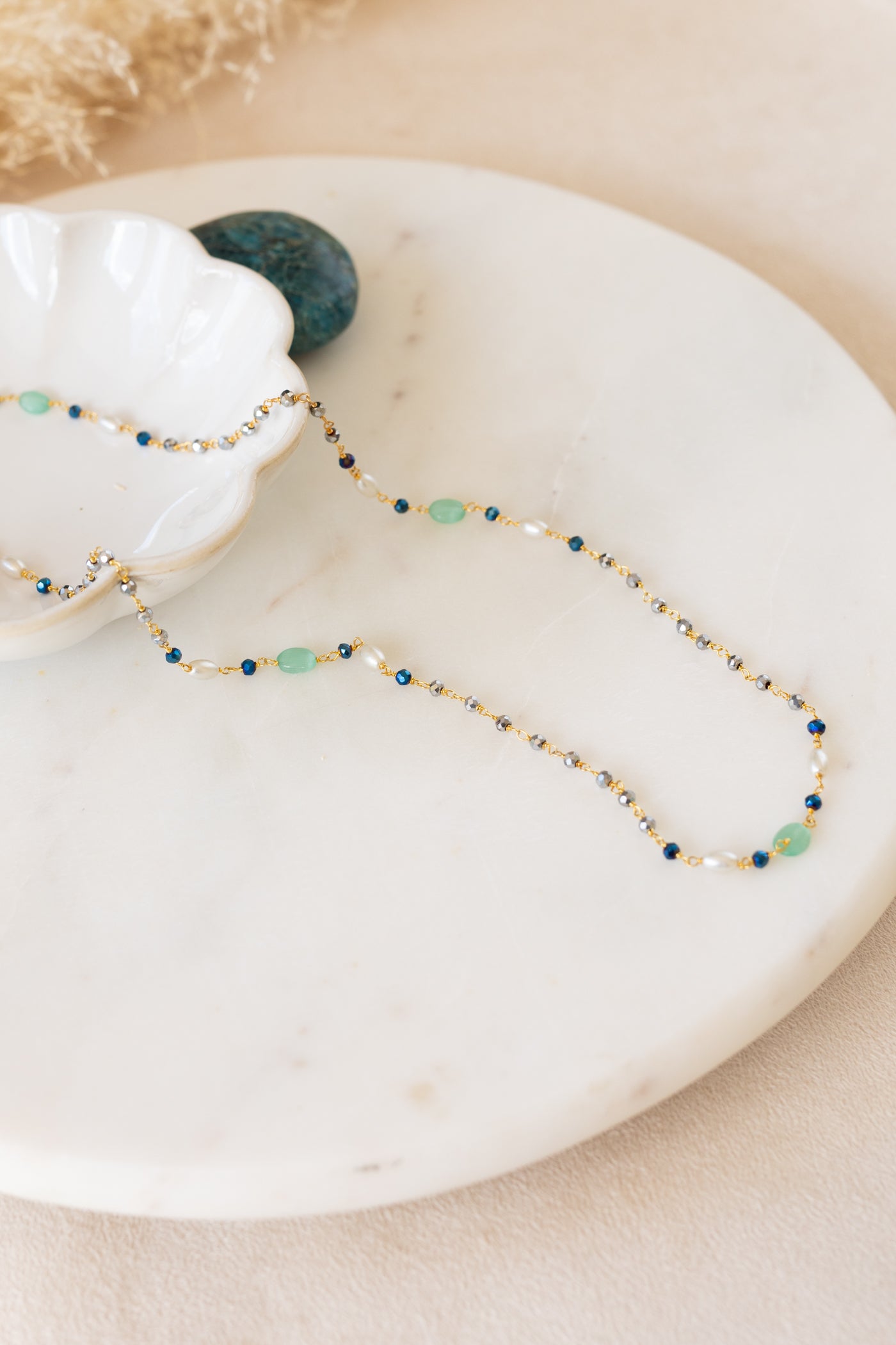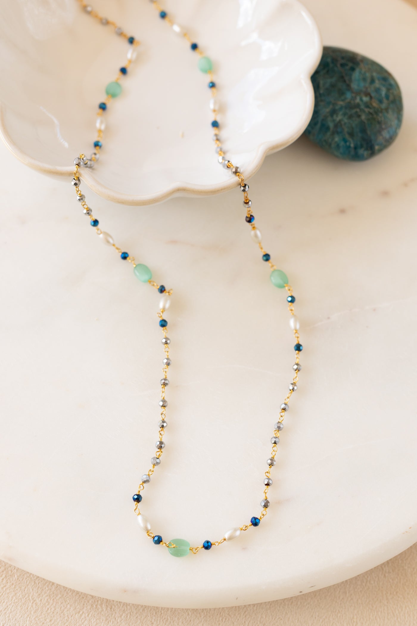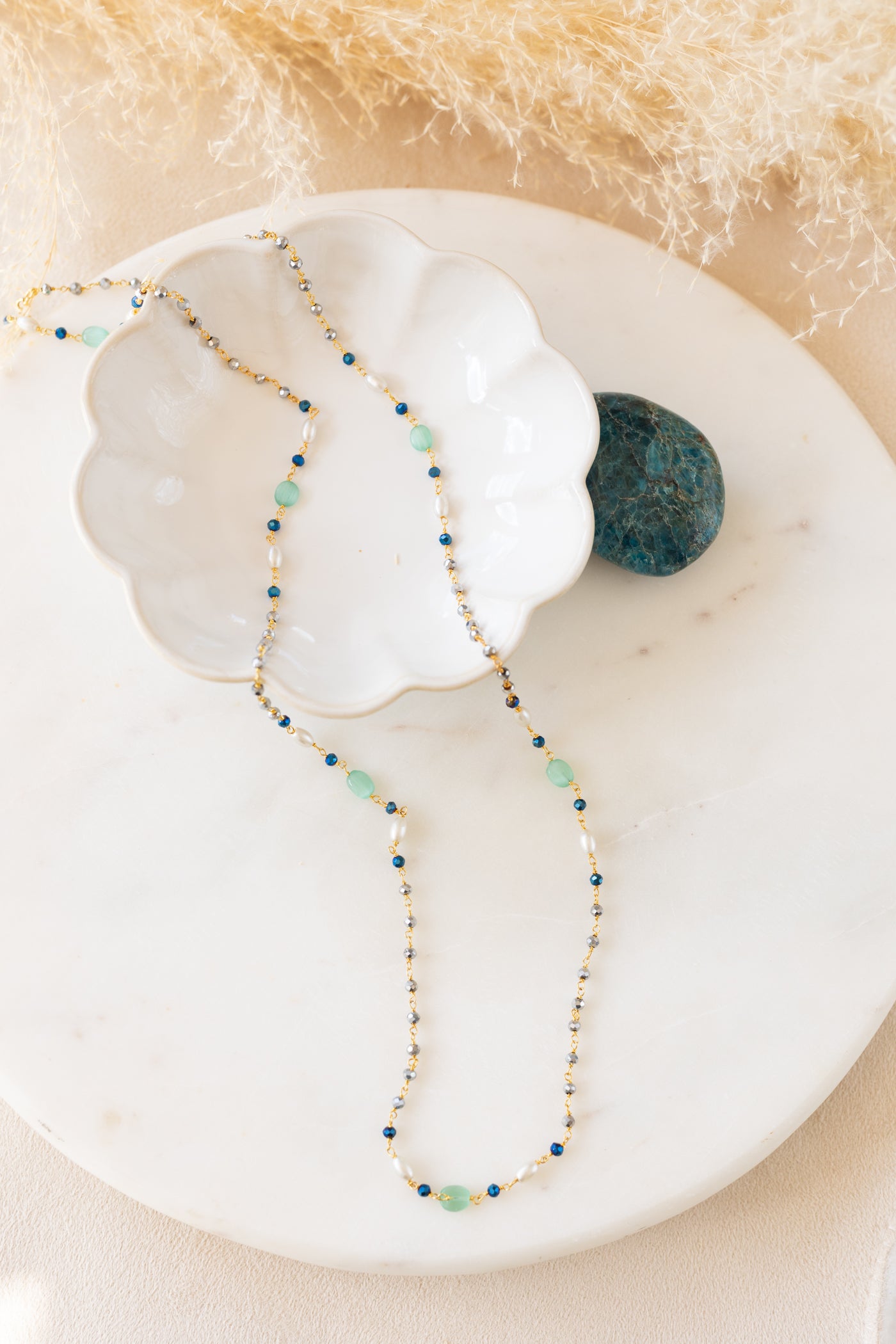° Sautoir en maillons plaqués or 24K et pierres semi-précieuses de quartz, d'apatite, aventurine, perles d'eau douce et hématite