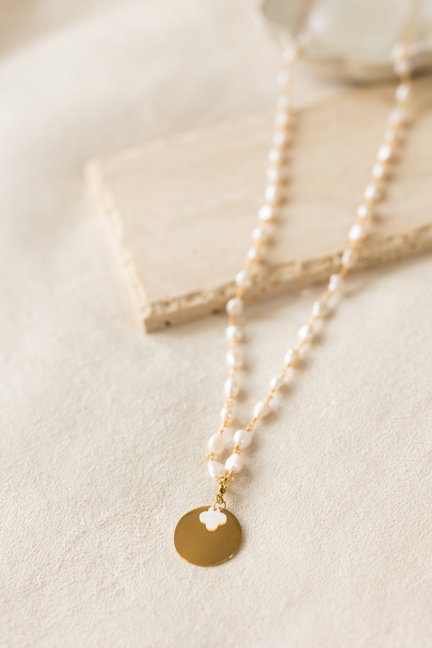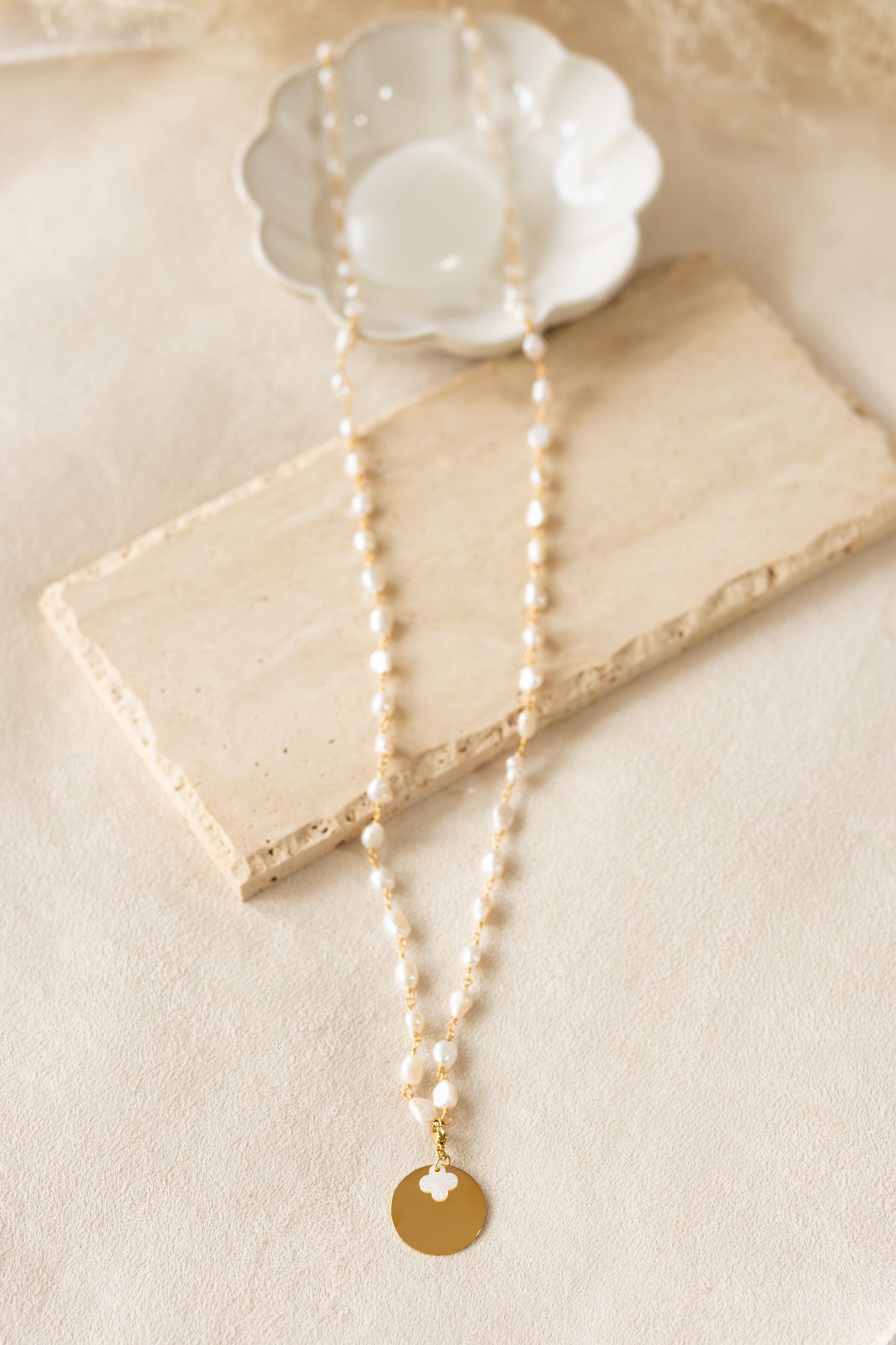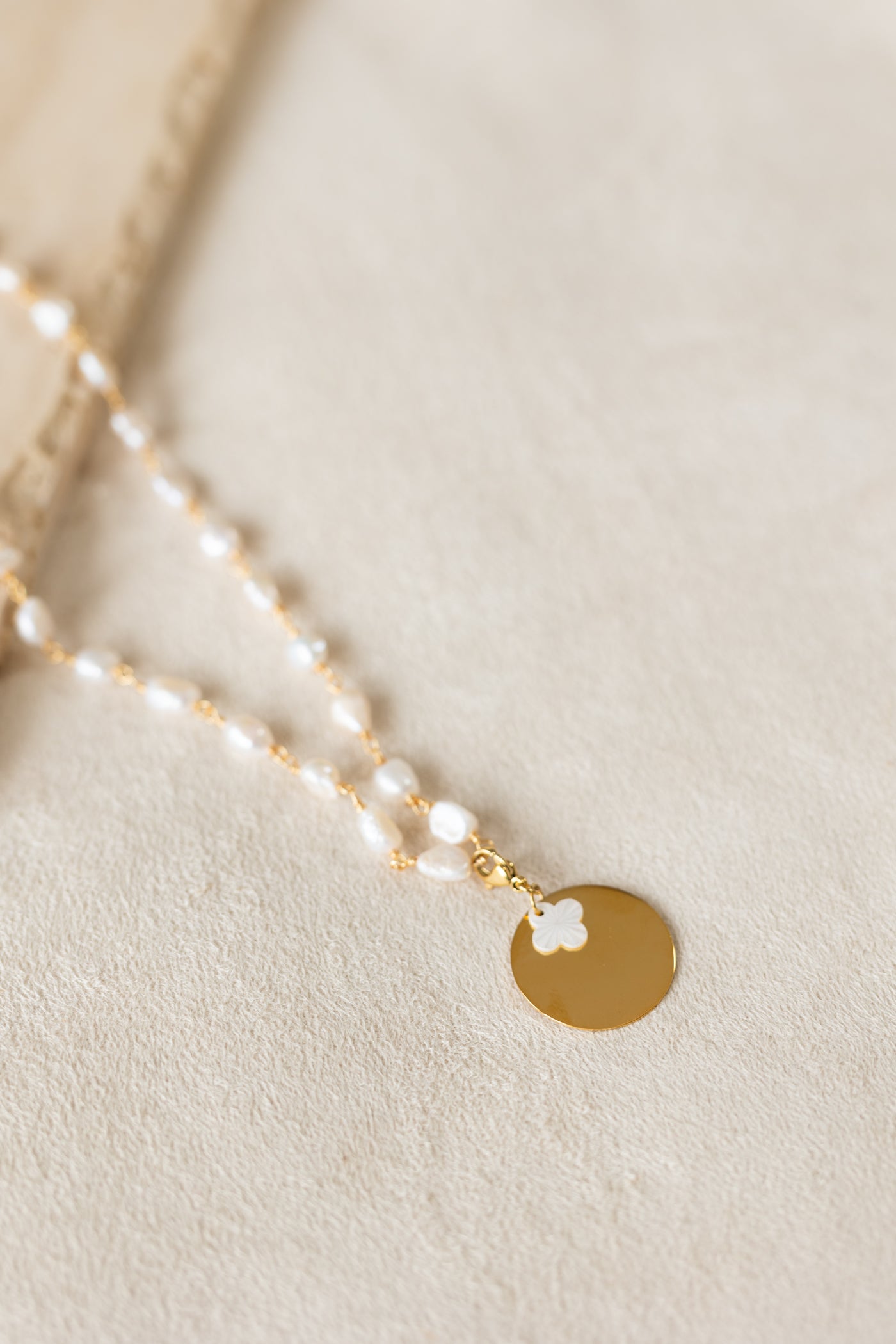 ° Sautoir en maillons plaqués or 24K et perles d'eau douce et son pendentif amovible rond et petit trèfle en nacre