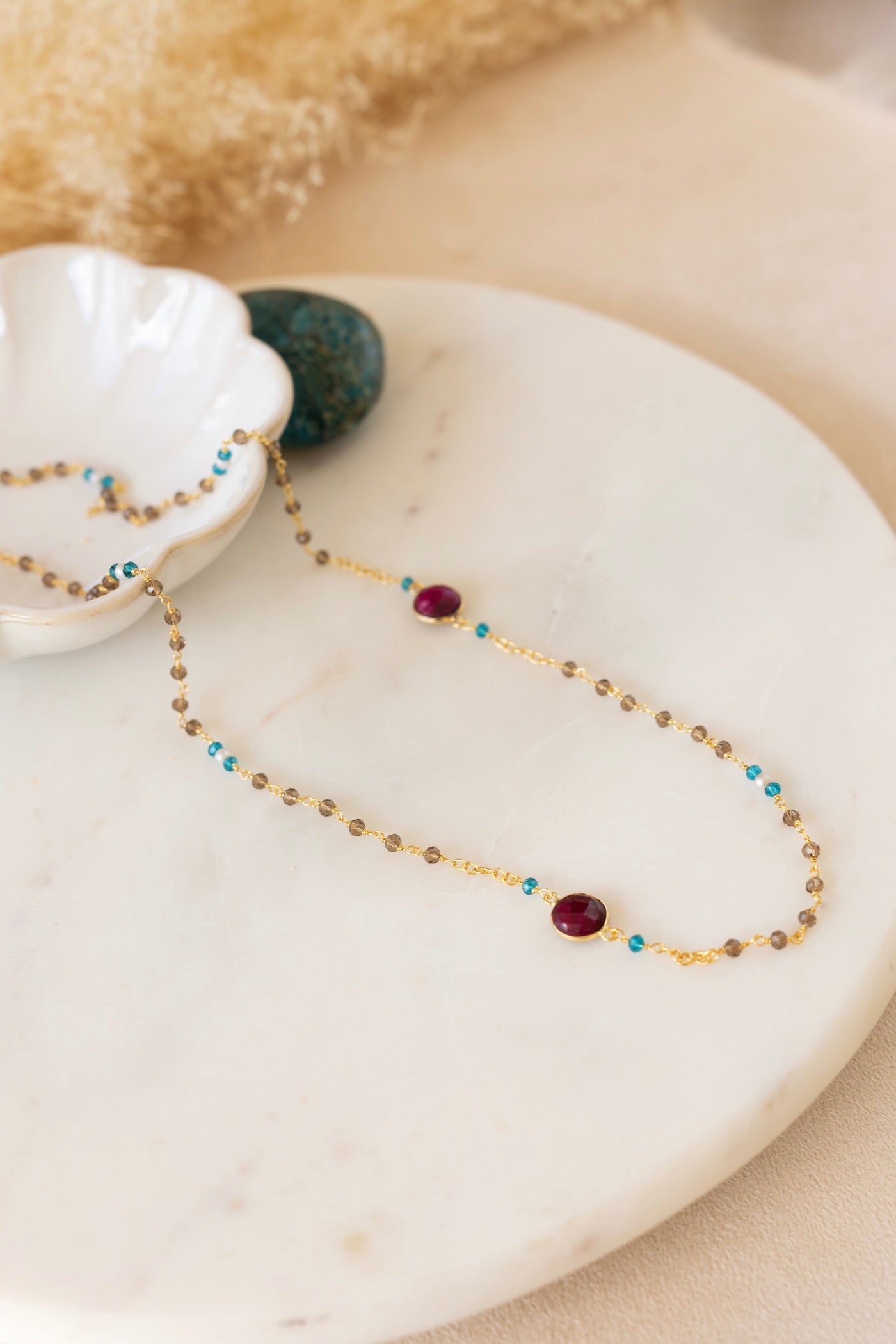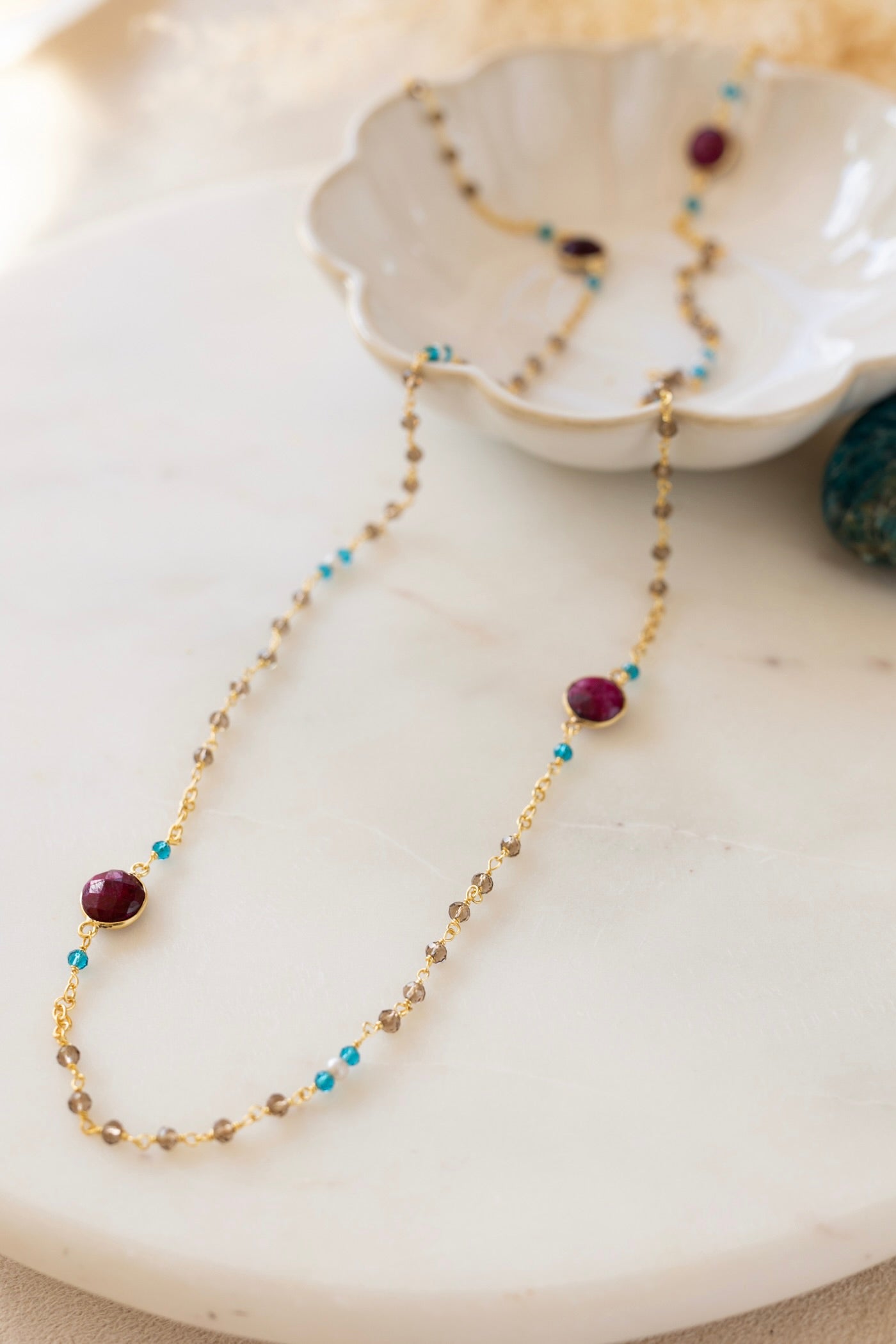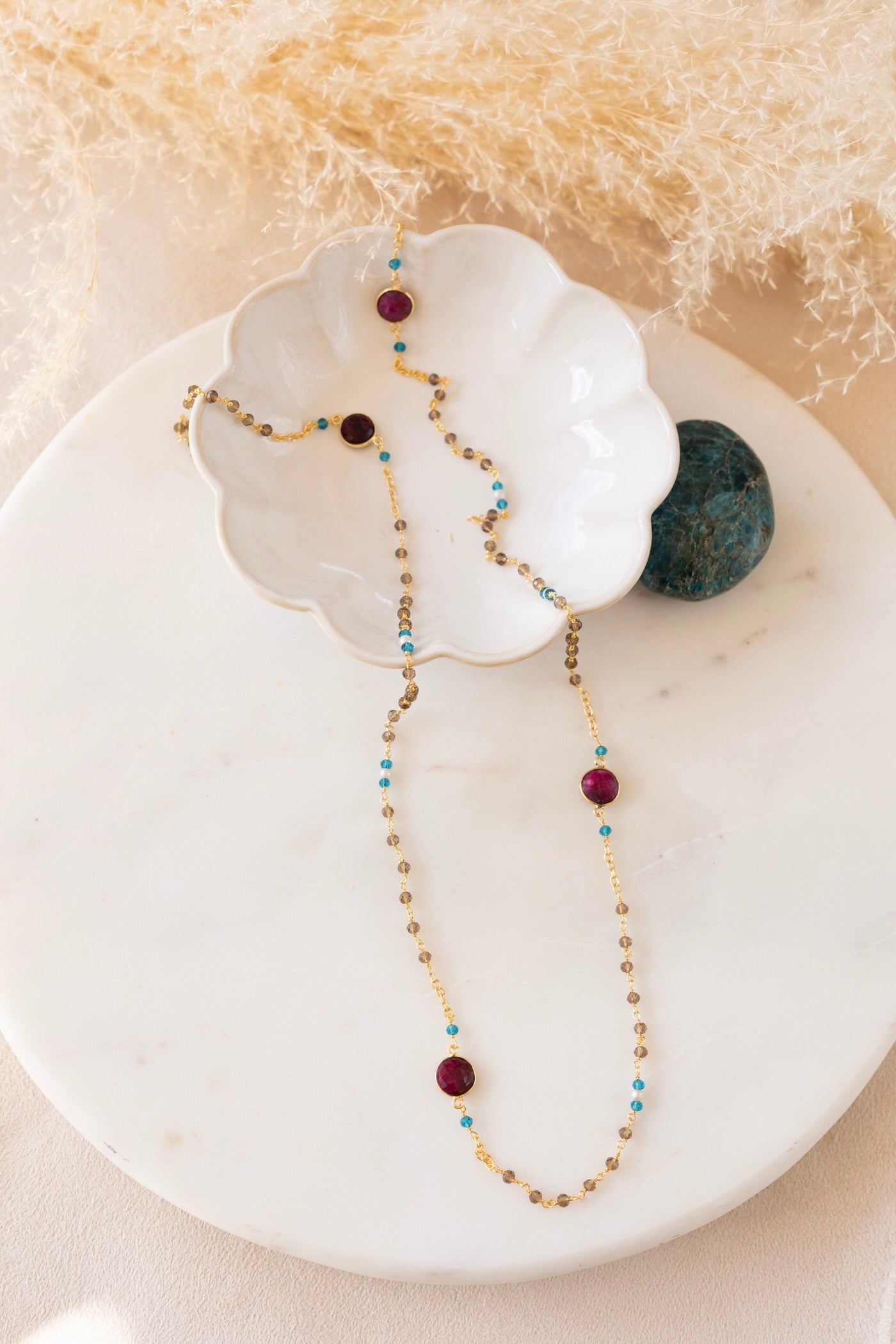 ° Sautoir en maillons plaqués or 24K et pierres semi-précieuses d'apatite, rubis, quartz fumé et perles d'eau douce