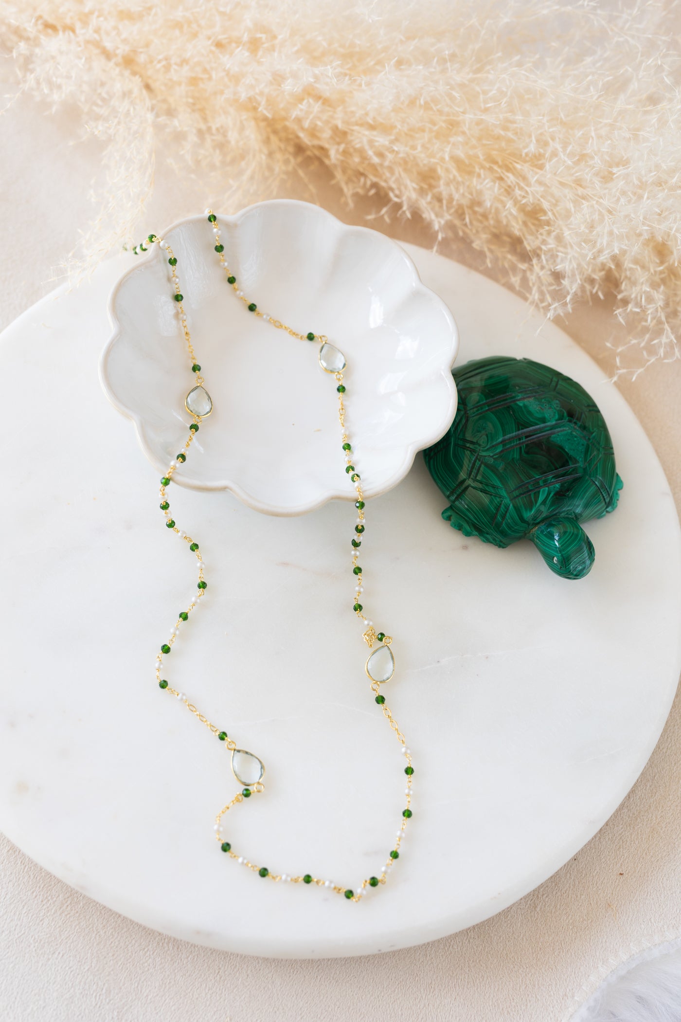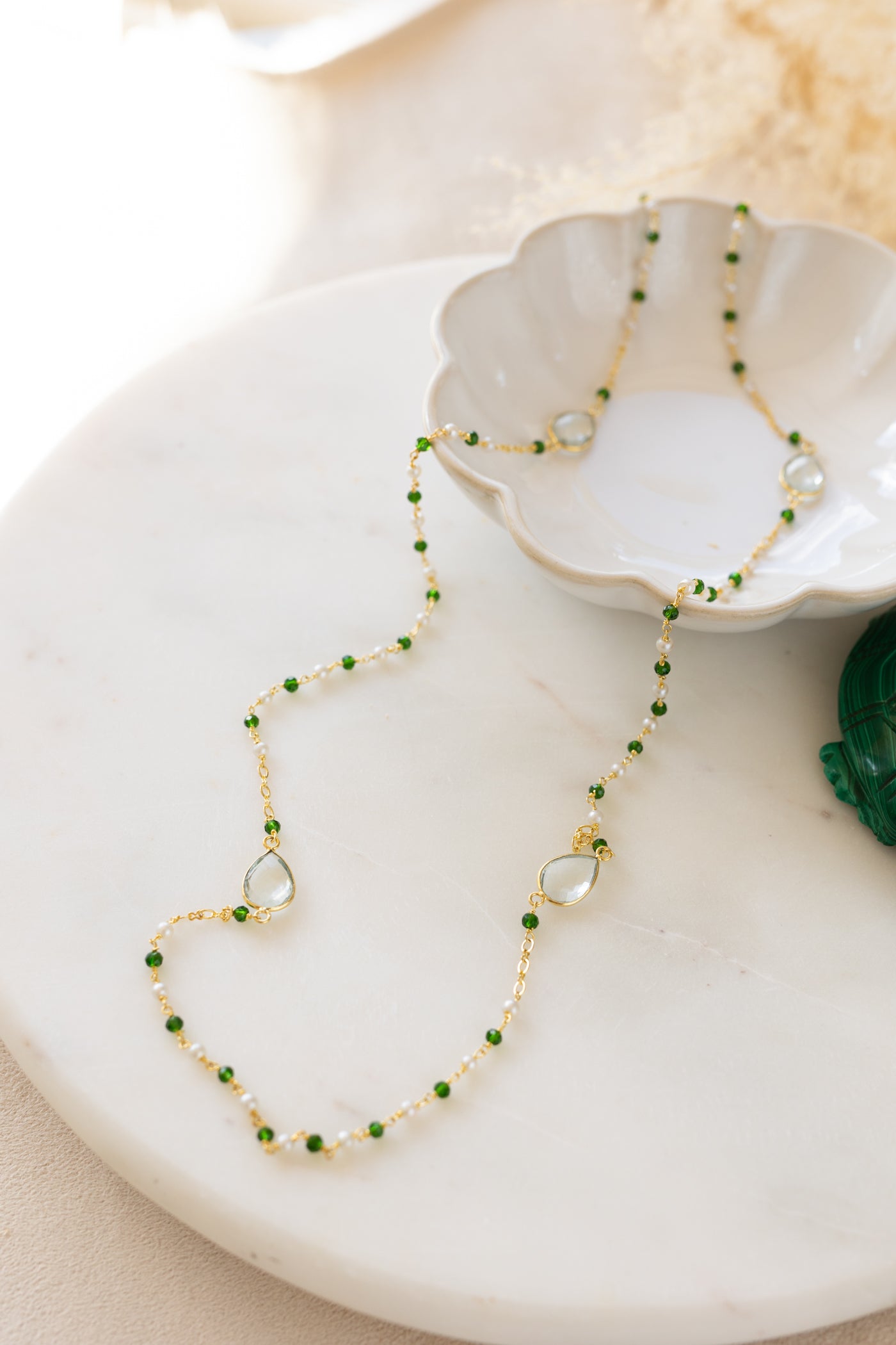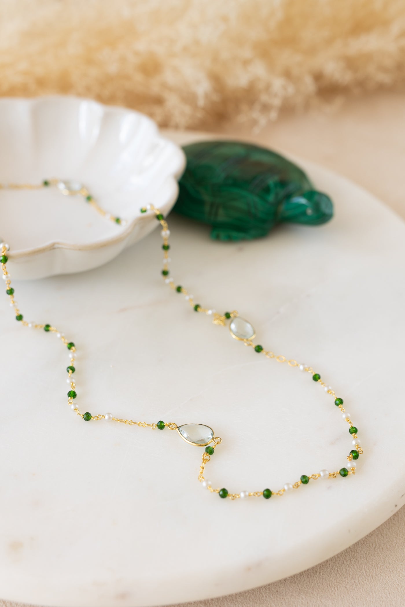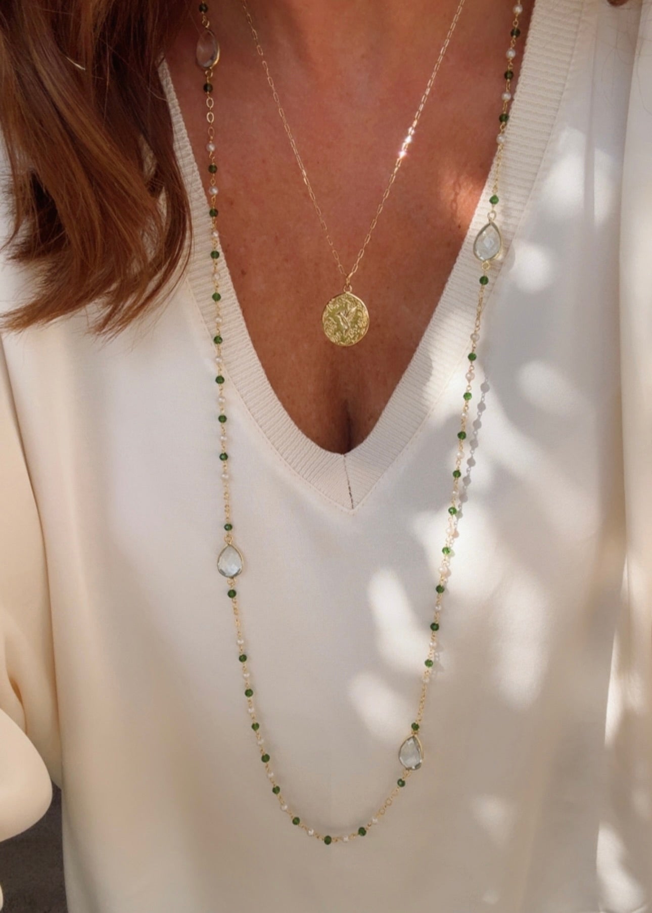 ° Sautoir en maillons plaqués or 24K et pierres semi-précieuses péridot et perles d'eau douce