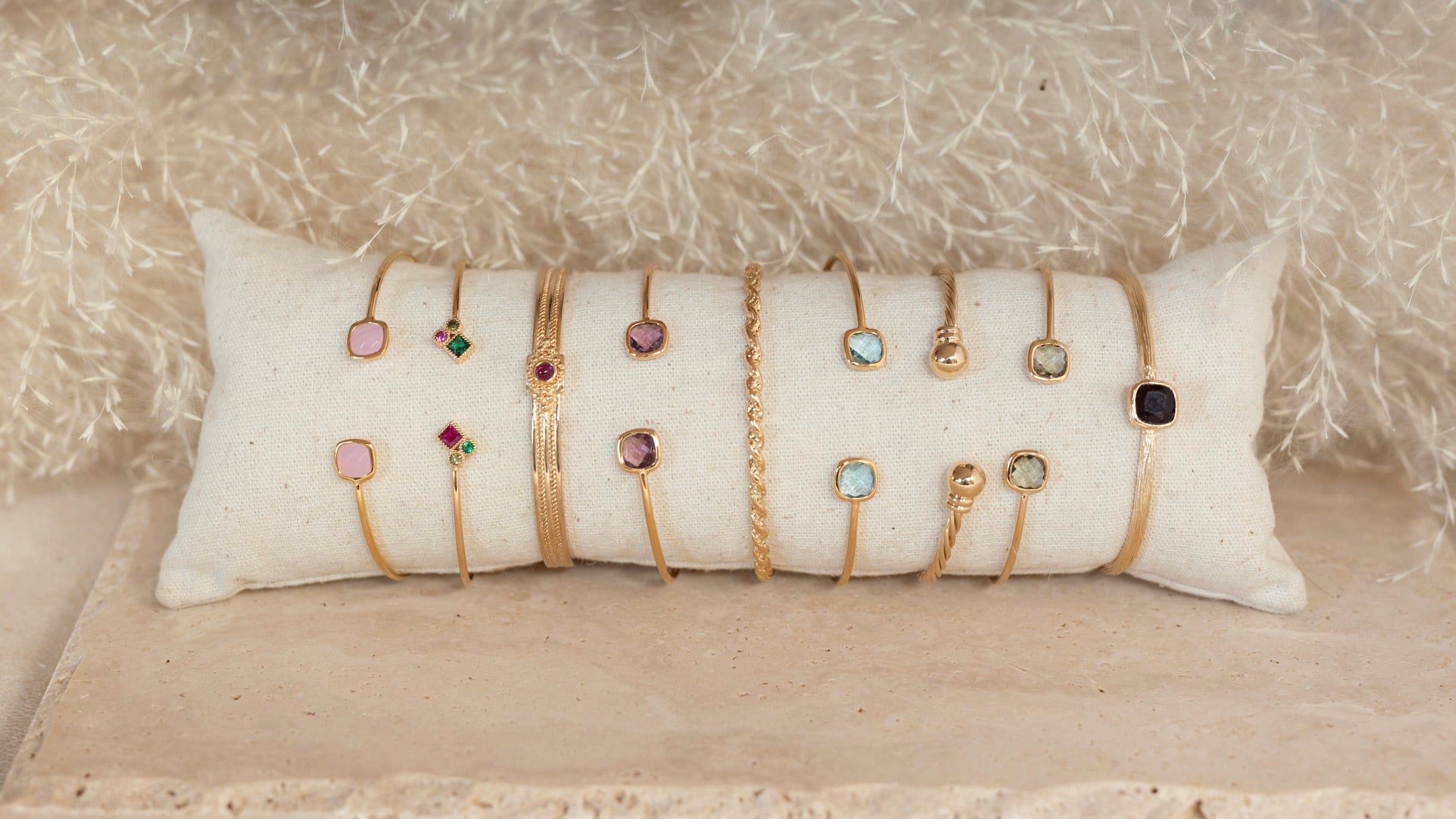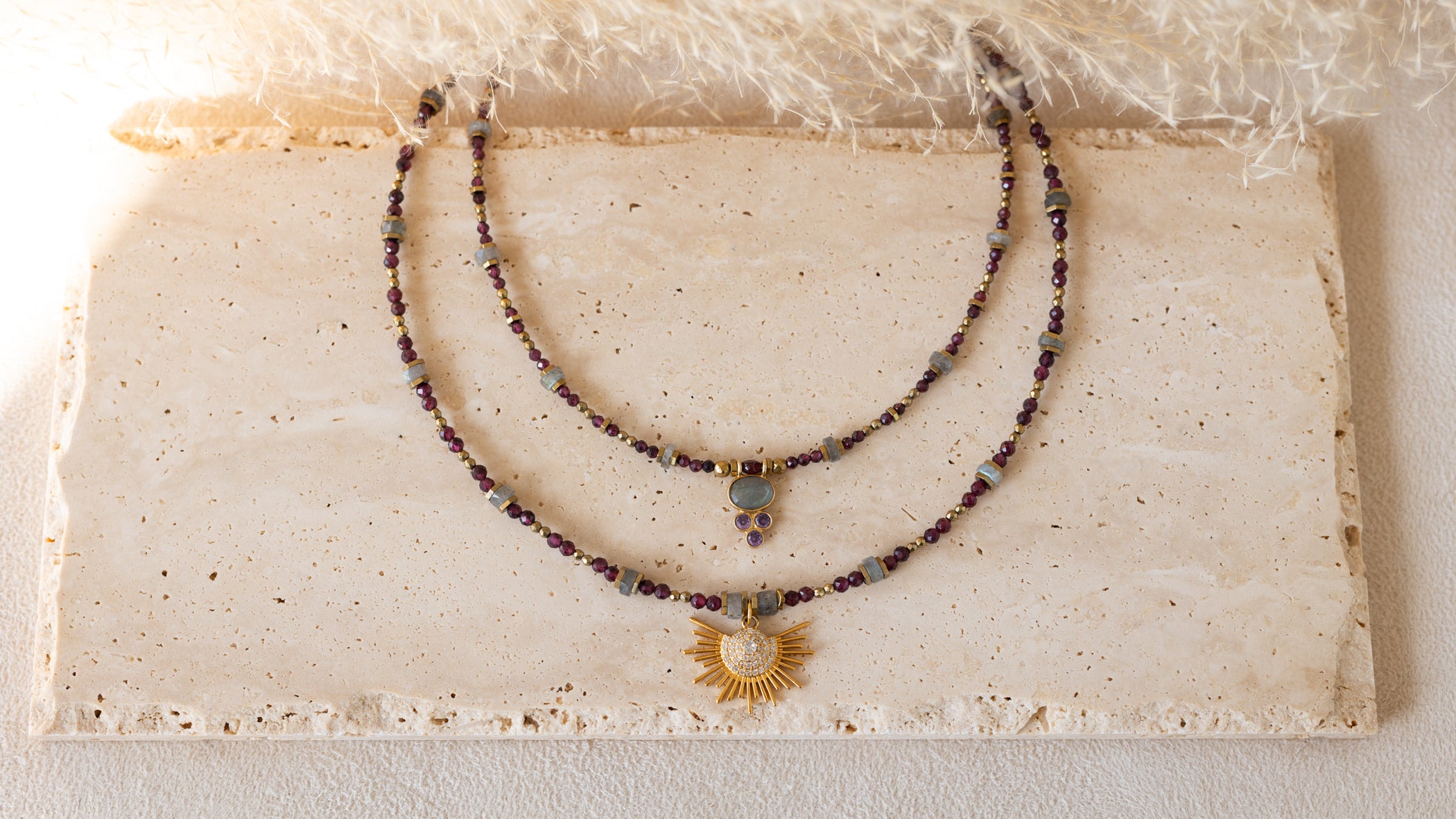 Les fils dorés, chaînes et pampilles en plaqué or ou argent mettent en valeur de magnifiques pierres semi-précieuses aux vertus énergisantes ou apaisantes.