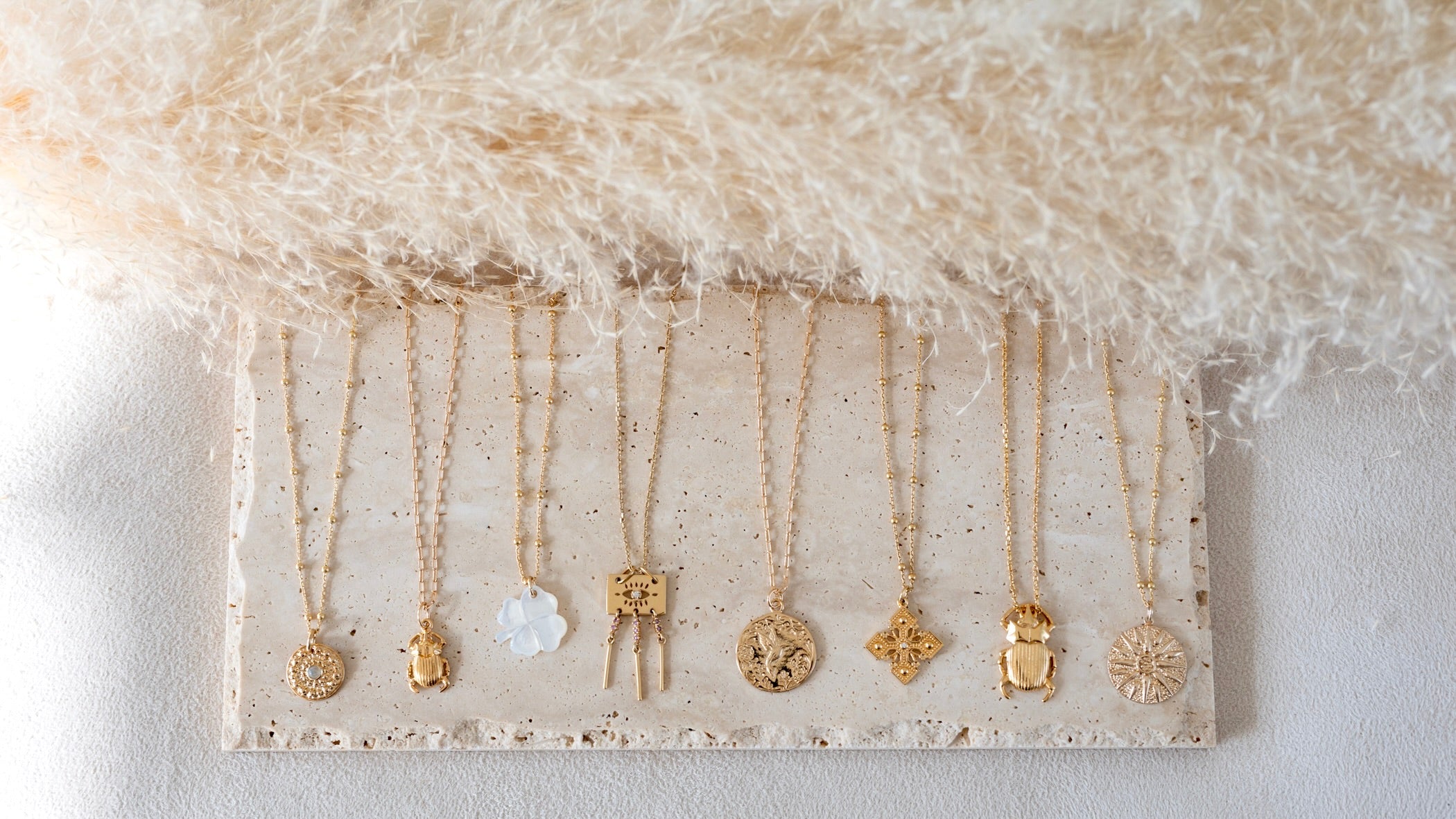Les fils dorés, chaînes et pampilles en plaqué or ou argent mettent en valeur de magnifiques pierres semi-précieuses aux vertus énergisantes ou apaisantes.