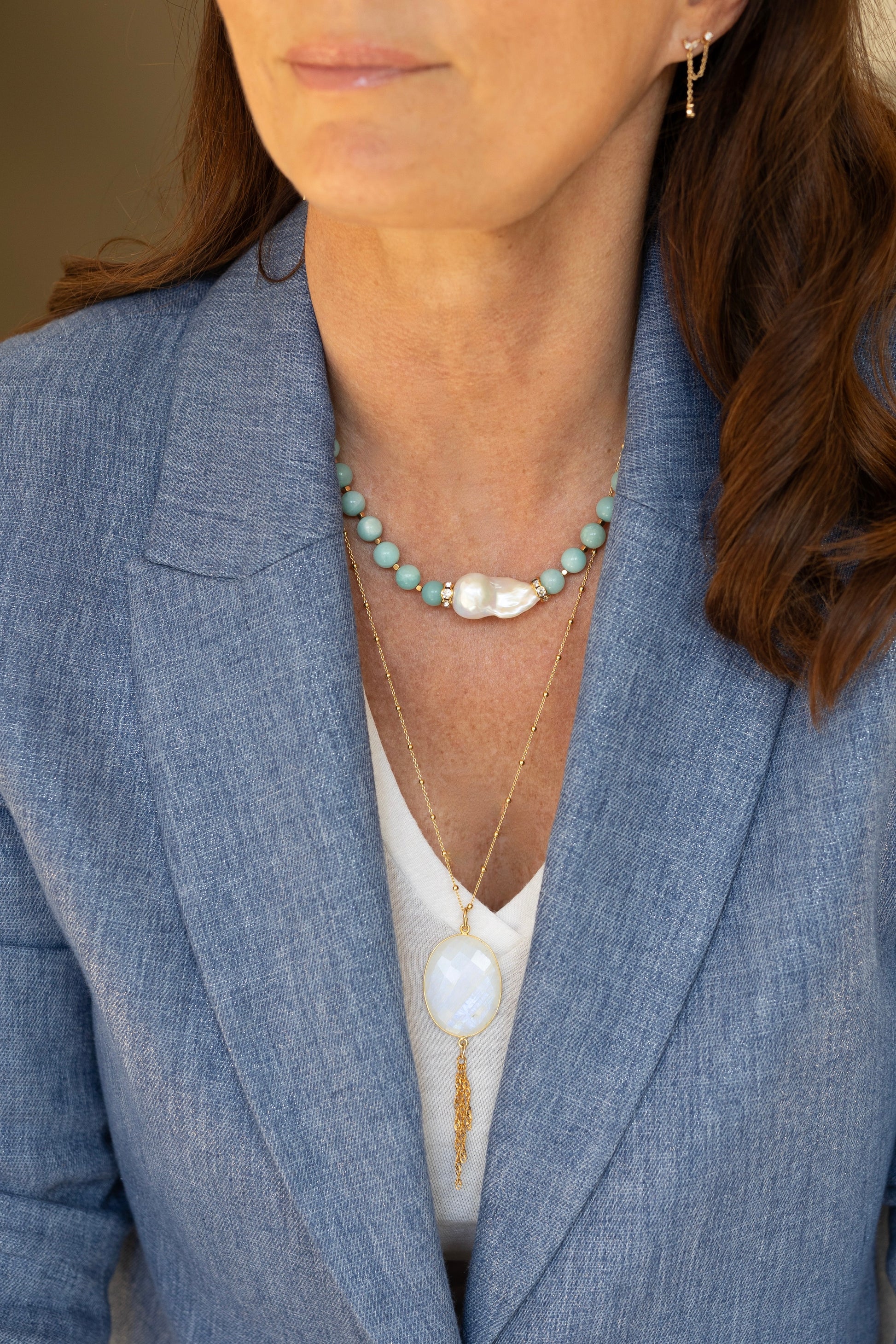 ° Collier en pierres fines semi-précieuses d'Amazonite, hématite dorée et perle d'eau douce
