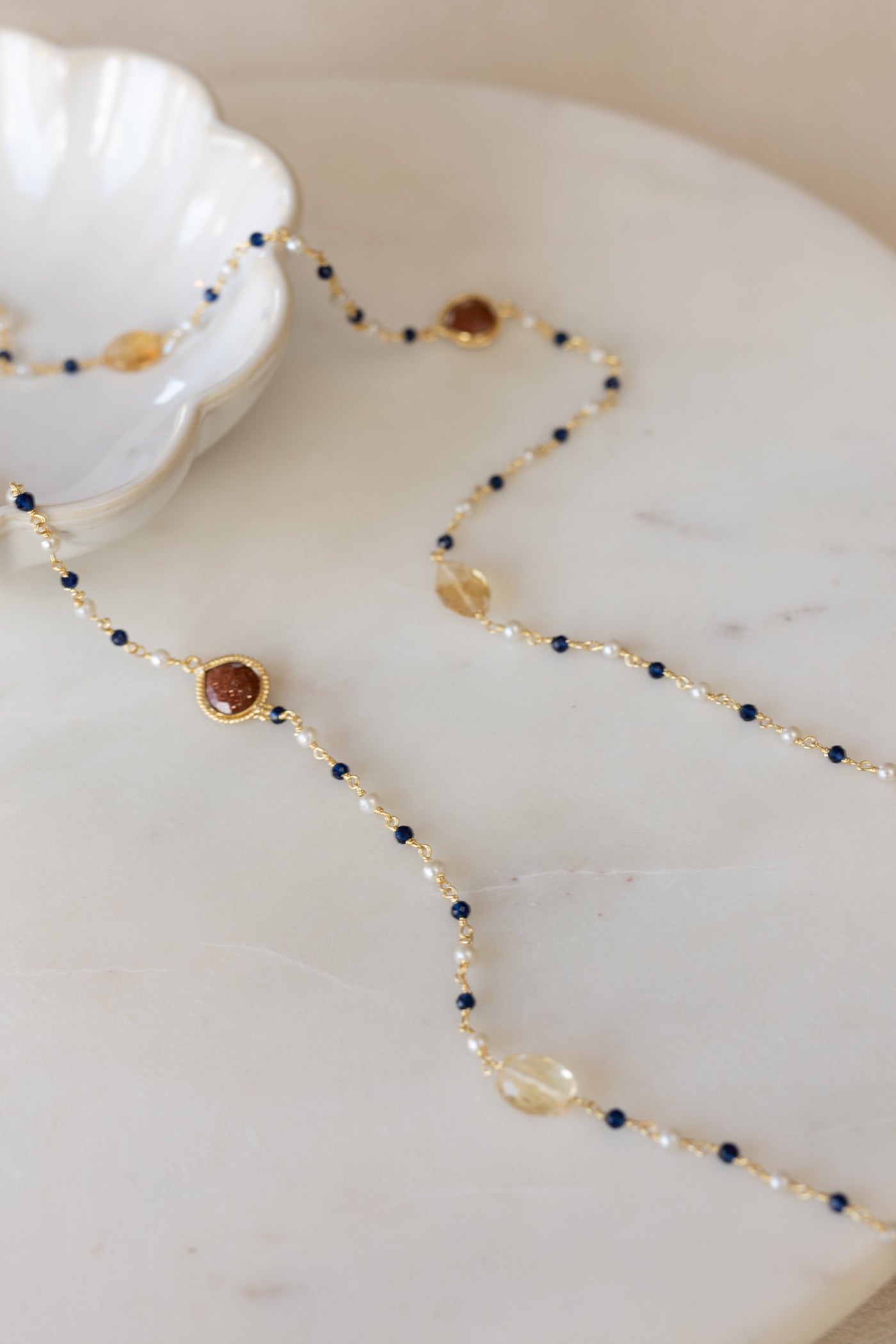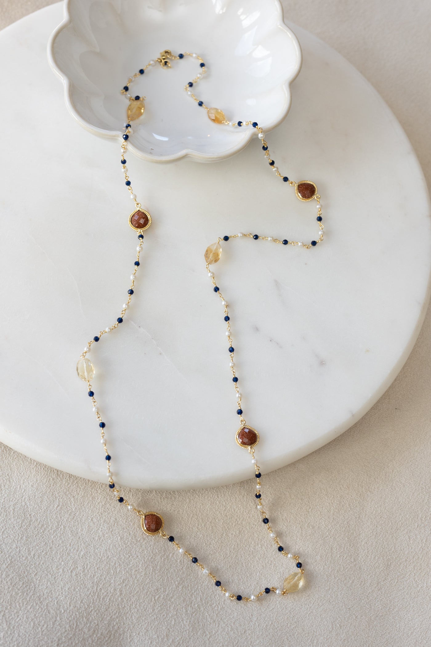 ° Sautoir en maillons plaqué Or et pierres semi-précieuses de Citrine et quartz, lapis-lazuli